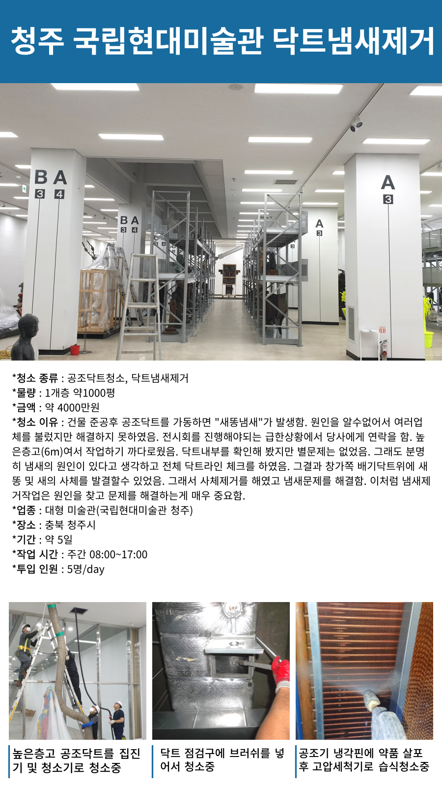 닫기 화재냄새제거청소(천장 판낼,닥트청소) 화재냄새가 안없어지나요? 냄새는 원인(분진,동물사체)를 정확힌 파악 및 제거해야지만 없어집니다. 부분 청소가 아니라 천장 모든부분의 비주얼체크는 필수입니다 견적문의를 남기시면 보다 다양한 실제 시공 사례 및 무료 출장 혜택이 있습니다. > 견적문의 하러가기 < 첨부파일 공유하기 페이스북 네이버 메일 주소복사 좋아요5 닫기